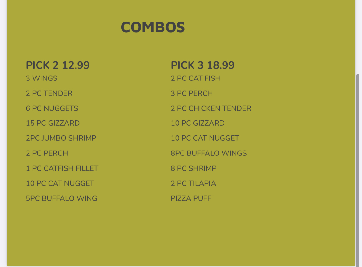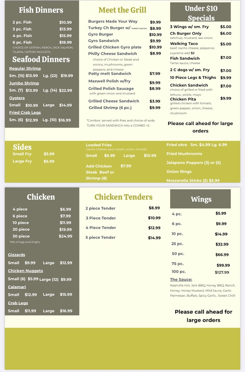 **Fried Fish: 6 pcs** Choice of catfish, perch, tilapia, or jack salmon.