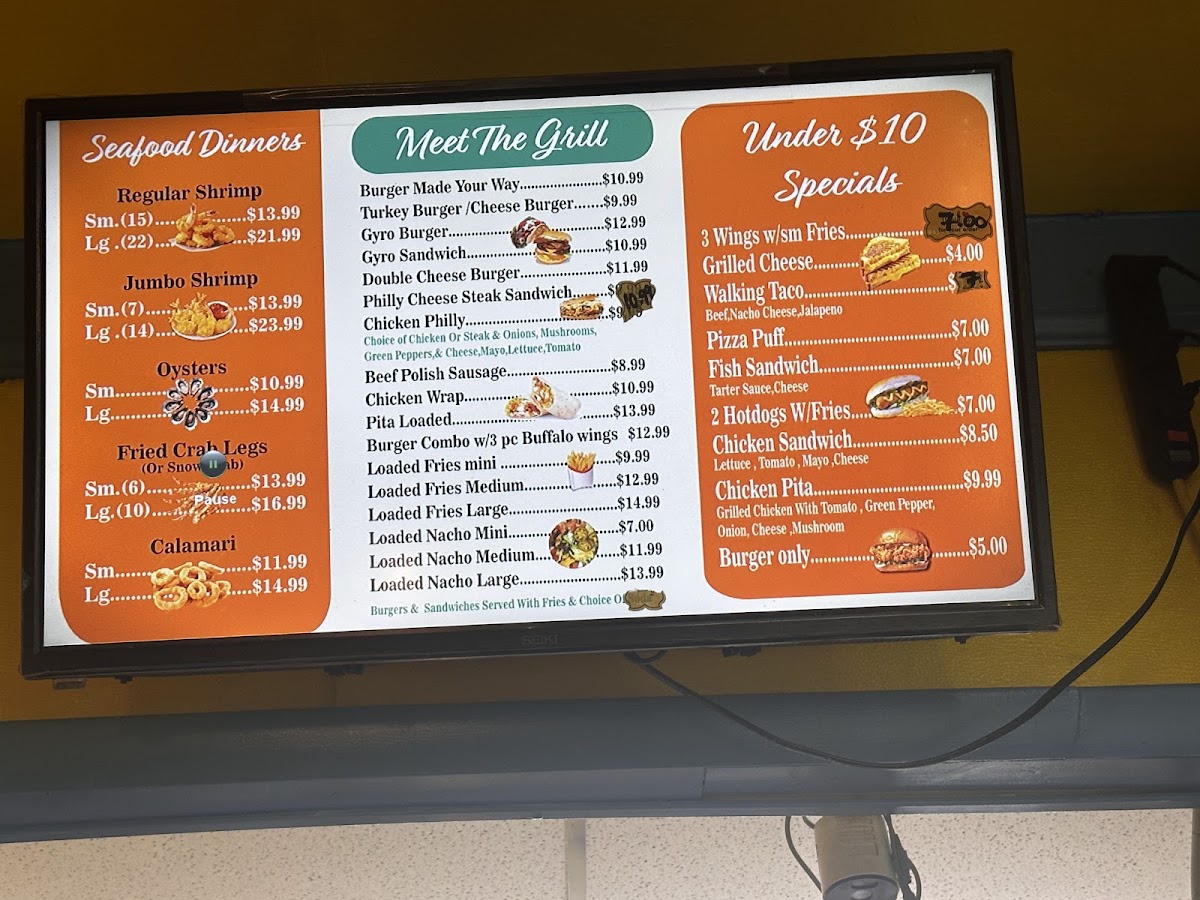 Pick 2 options: wings, tenders, crab legs, shrimp, fish fillets, seafood, pizza puff, mozzarella sticks, jalapeño poppers, gizzards, grilled cheese.