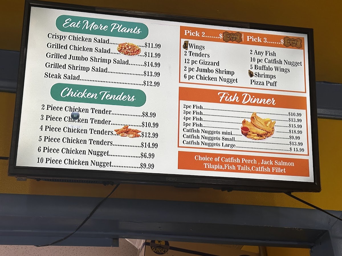 Fried fish options: catfish, perch, tilapia, or jack salmon.