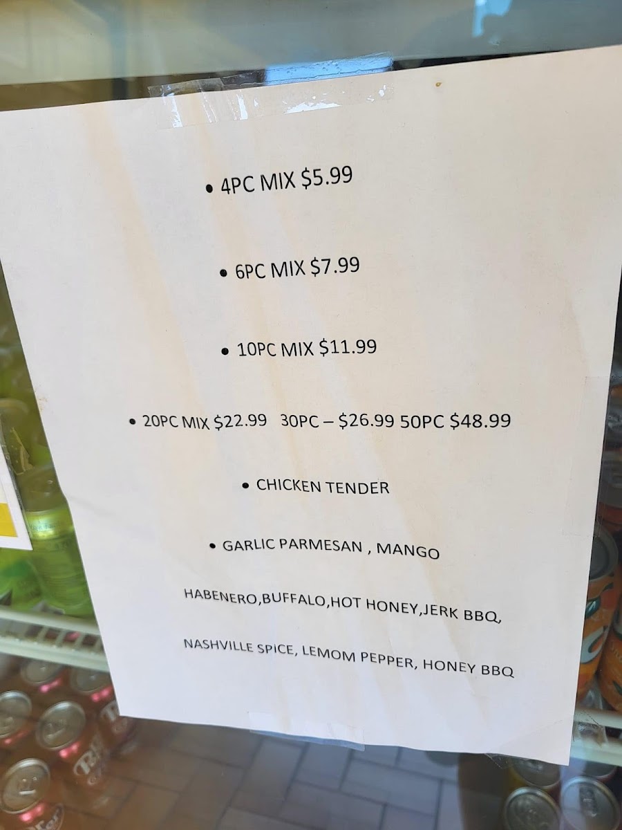 Six chicken wings. Select from honey BBQ, mango habanero, buffalo, garlic parmesan, plain, Cajun, or lemon pepper sauce.